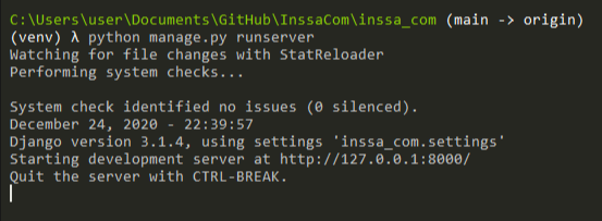 inssa_com 폴더로 들어가서, runserver 명령어를 실행한다. runserver 명령어는 서버를 작동시킨다.
