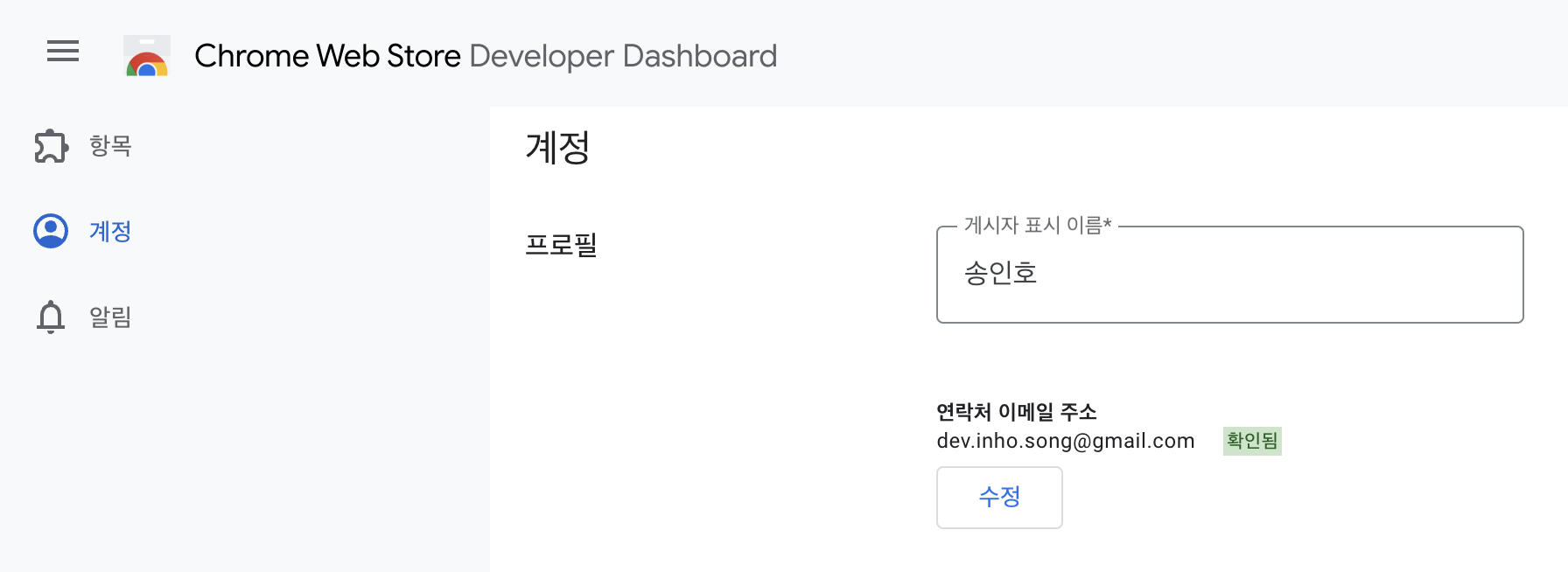 개발자 대시보드 > 계정 탭 > 프로필 > 연락처 이메일 주소